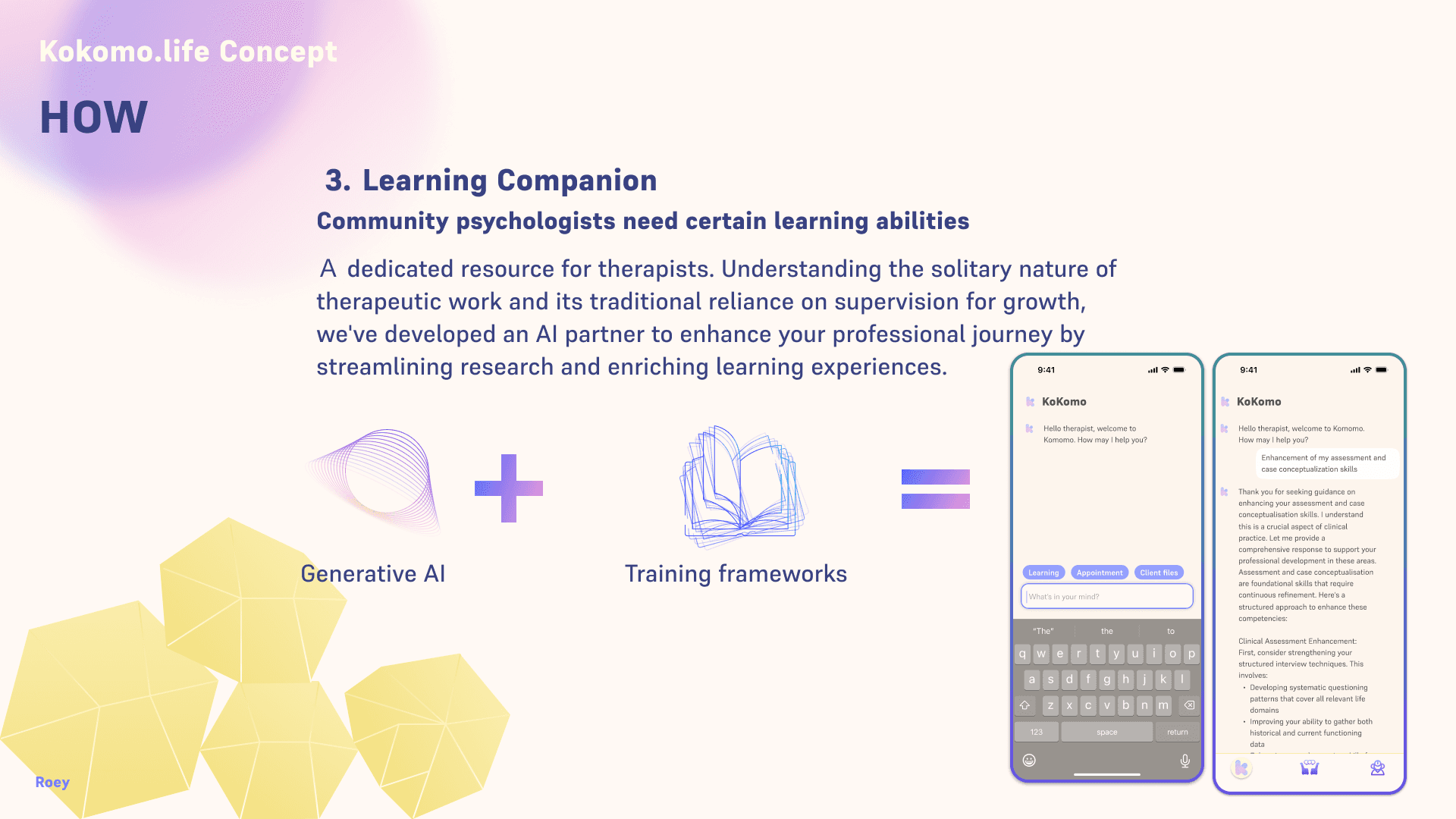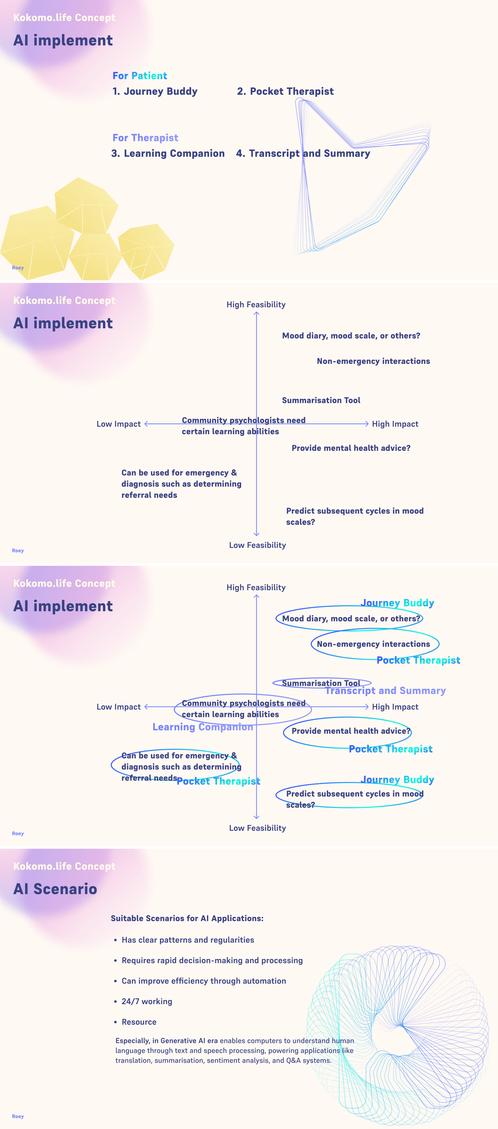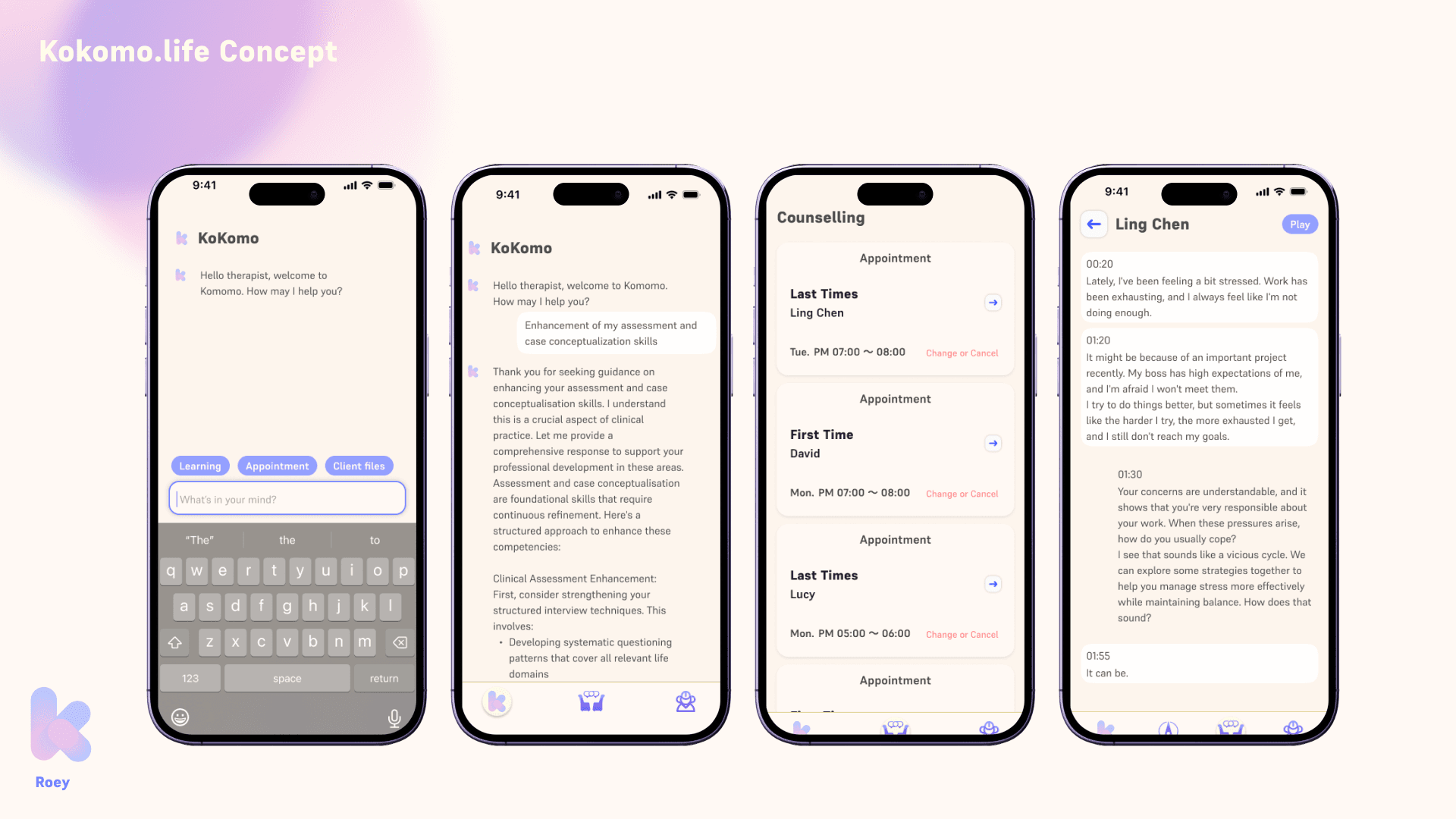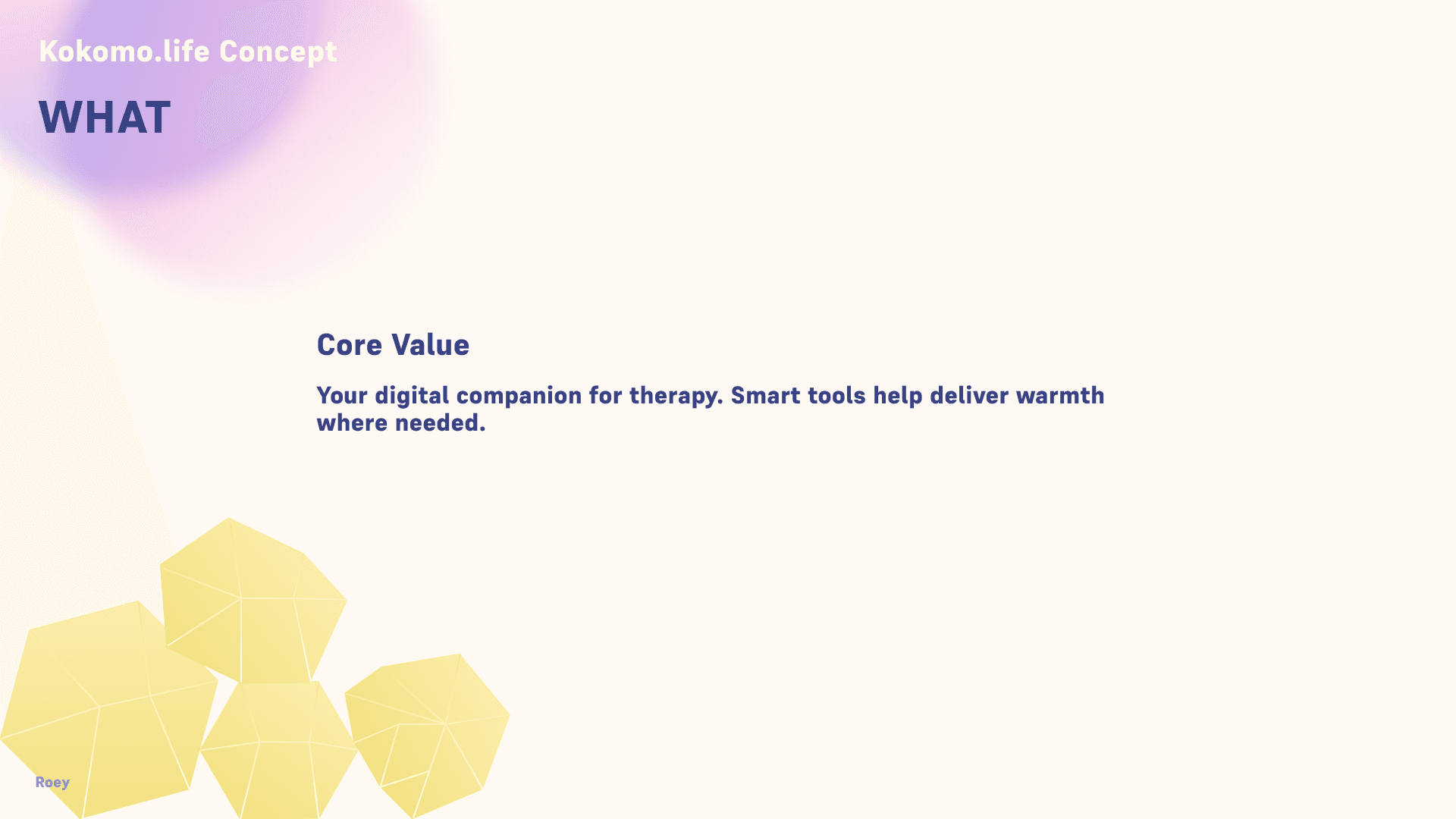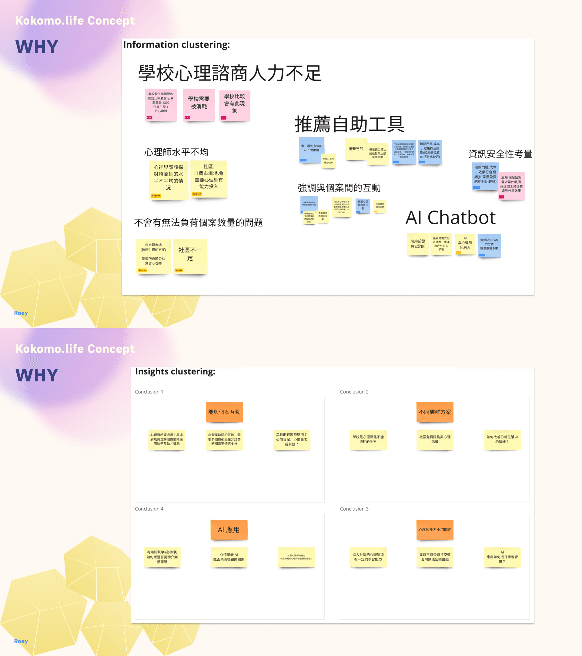 Kokomo 針對上述的研究提出了『心理師和個案設計的產品,改變個案需自行尋找心理師的困境與使心理師攜帶我們開發的工具,深入各個角落,服務他們關心的人群,讓心理師成為服務的主體。』的概念並依此概念發展工具作為回應。