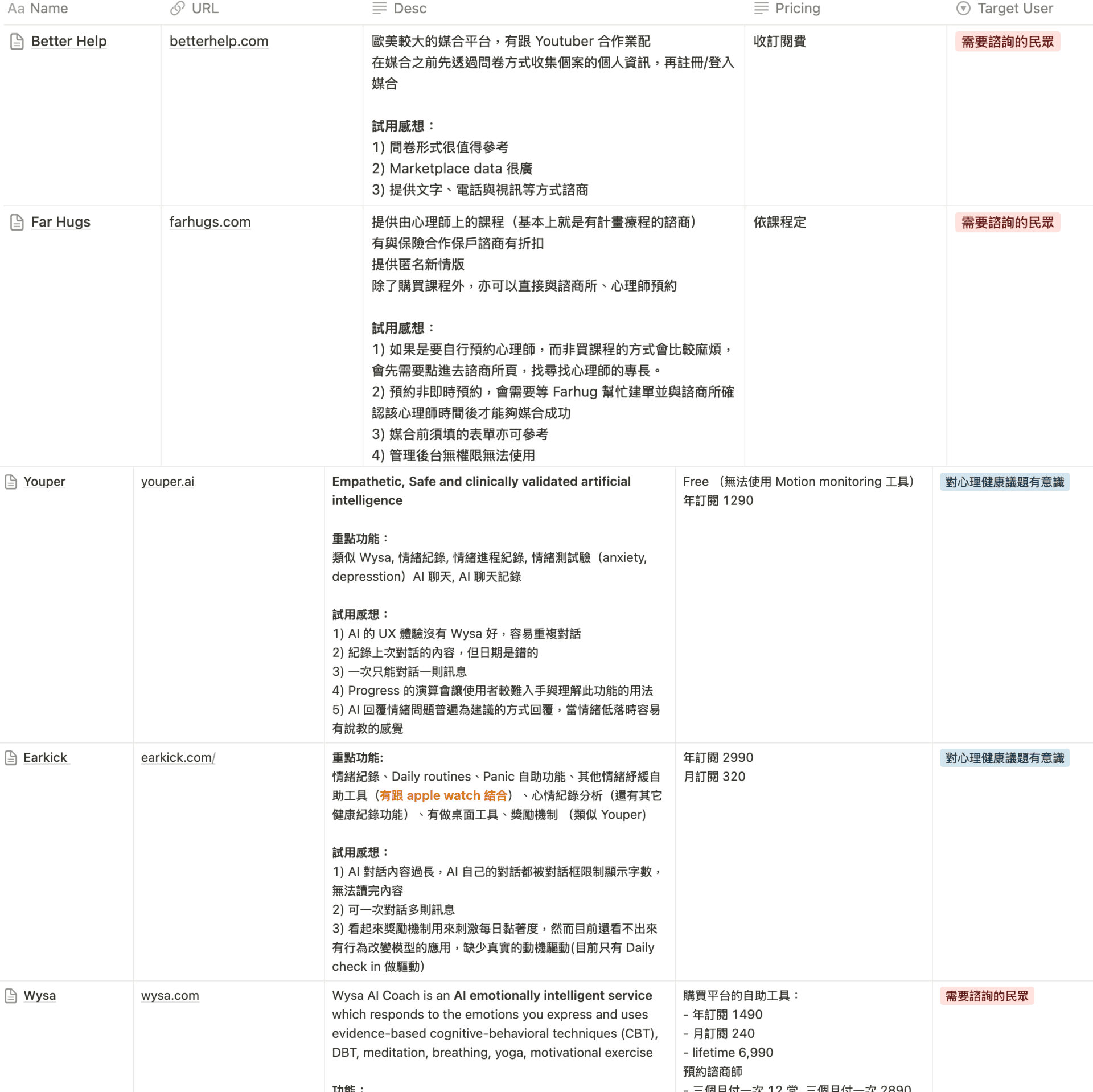 綜合來看,成功的關鍵似乎在於如何將 AI 技術與專業心理健康服務有效結合,透過訪談、二手研究與競品分析,我們發現多數產品維持在媒合或是個案自我救助的情境,但鮮少適用於個案與心理師的連結。
