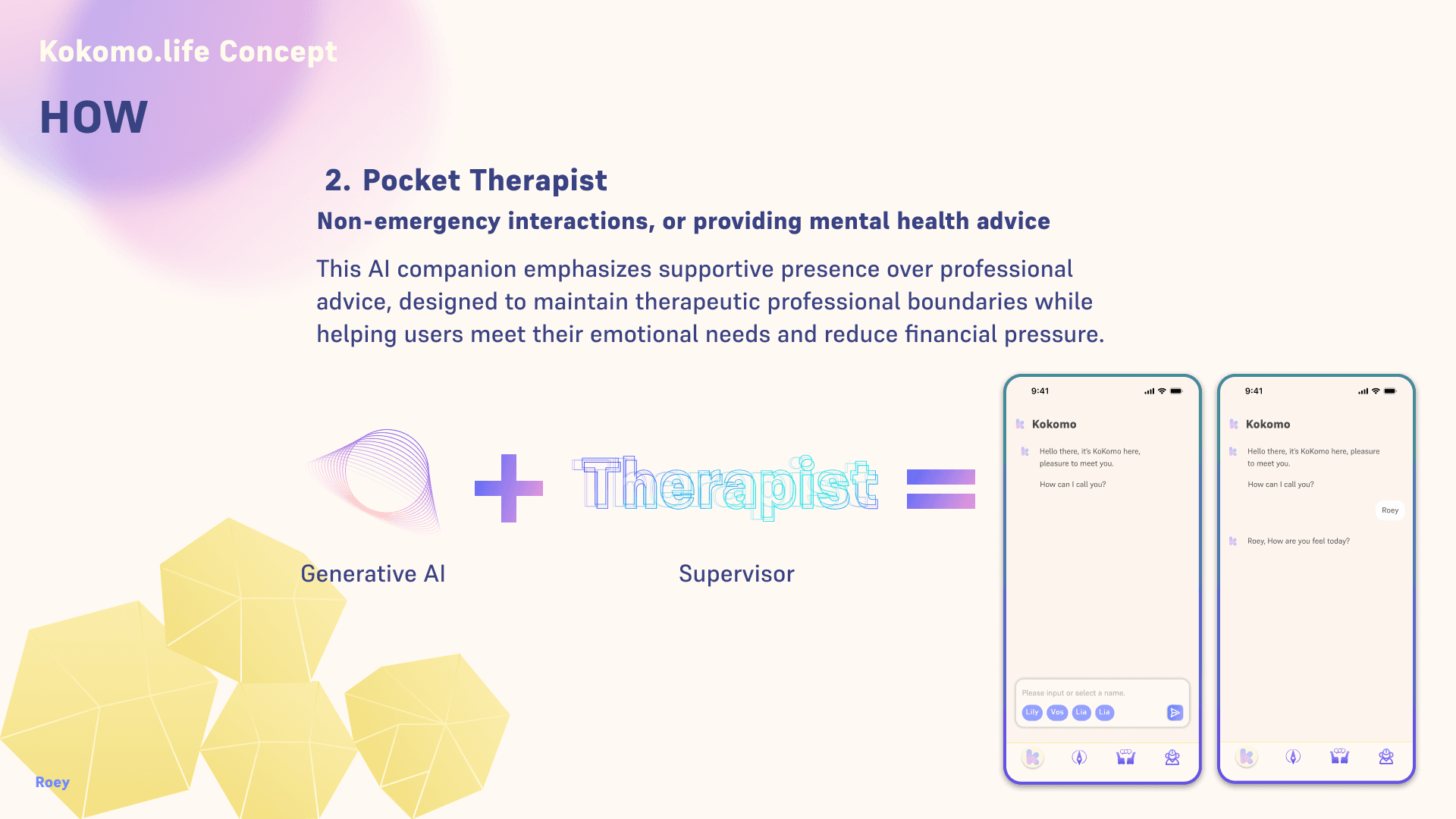 2. Pocket Therapist 將生成式 AI 與專業督導經驗相結合,創造出一個注重支持性陪伴的AI助手。它的特色在於維持清晰的專業界限,不提供直接的治療建議,而是著重於情緒支持和陪伴,透過溫和的對話方式,幫助使用者在日常生活中獲得情緒上的支持。