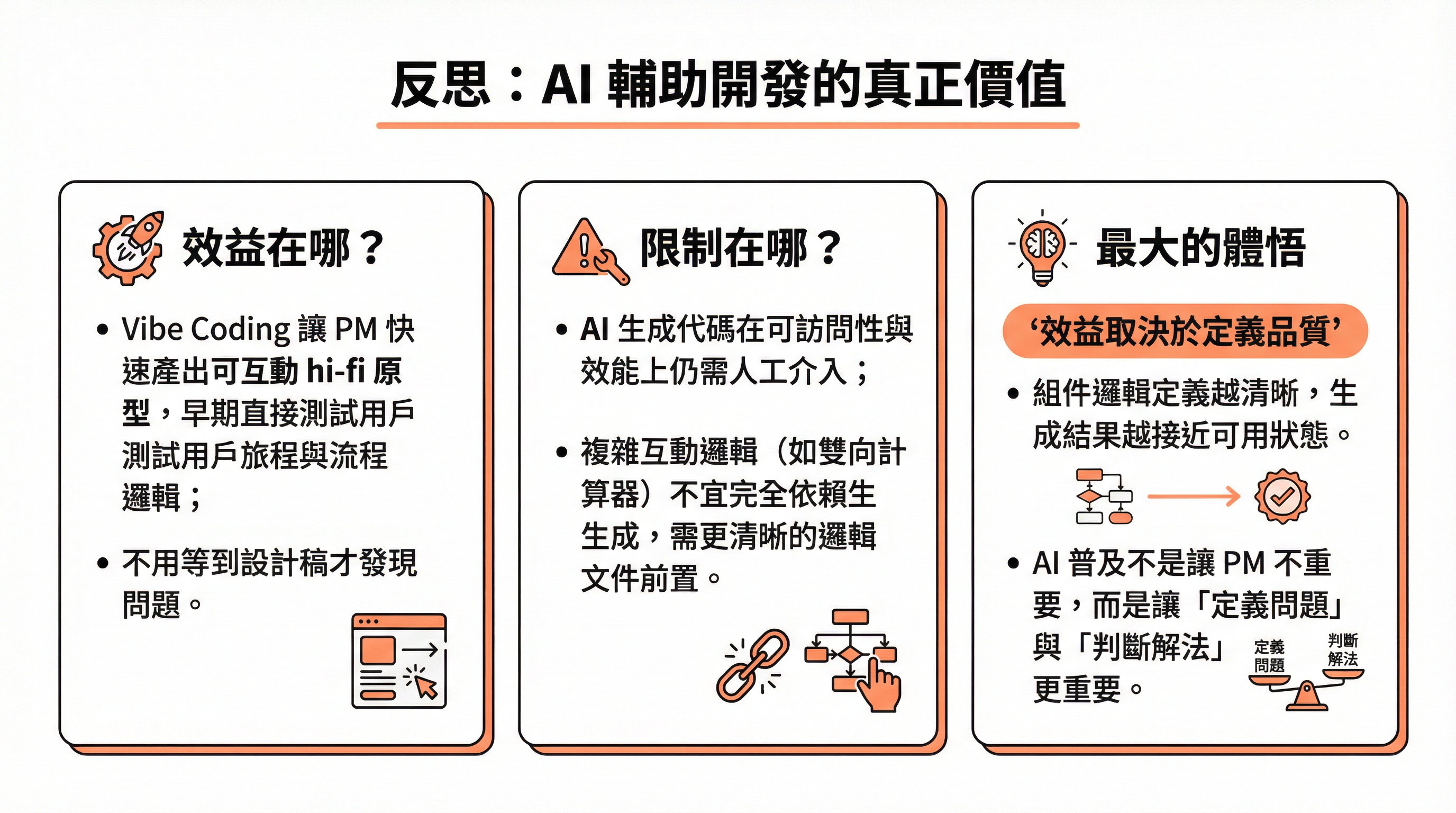 Vibe Coding 在這個流程裡扮演的角色,不是取代設計師或工程師,而是讓 PM 能夠快速產出可互動的 hi-fi 原型。有了接近真實的介面,就可以在早期直接測試用戶旅程與 CTA 邏輯是否成立,而不是等到設計稿才發現流程有問題。這個階段收斂後,再交由設計師優化介面細節、工程師進行結構重構——分工的邊界反而因此更清晰,而不是更模糊。