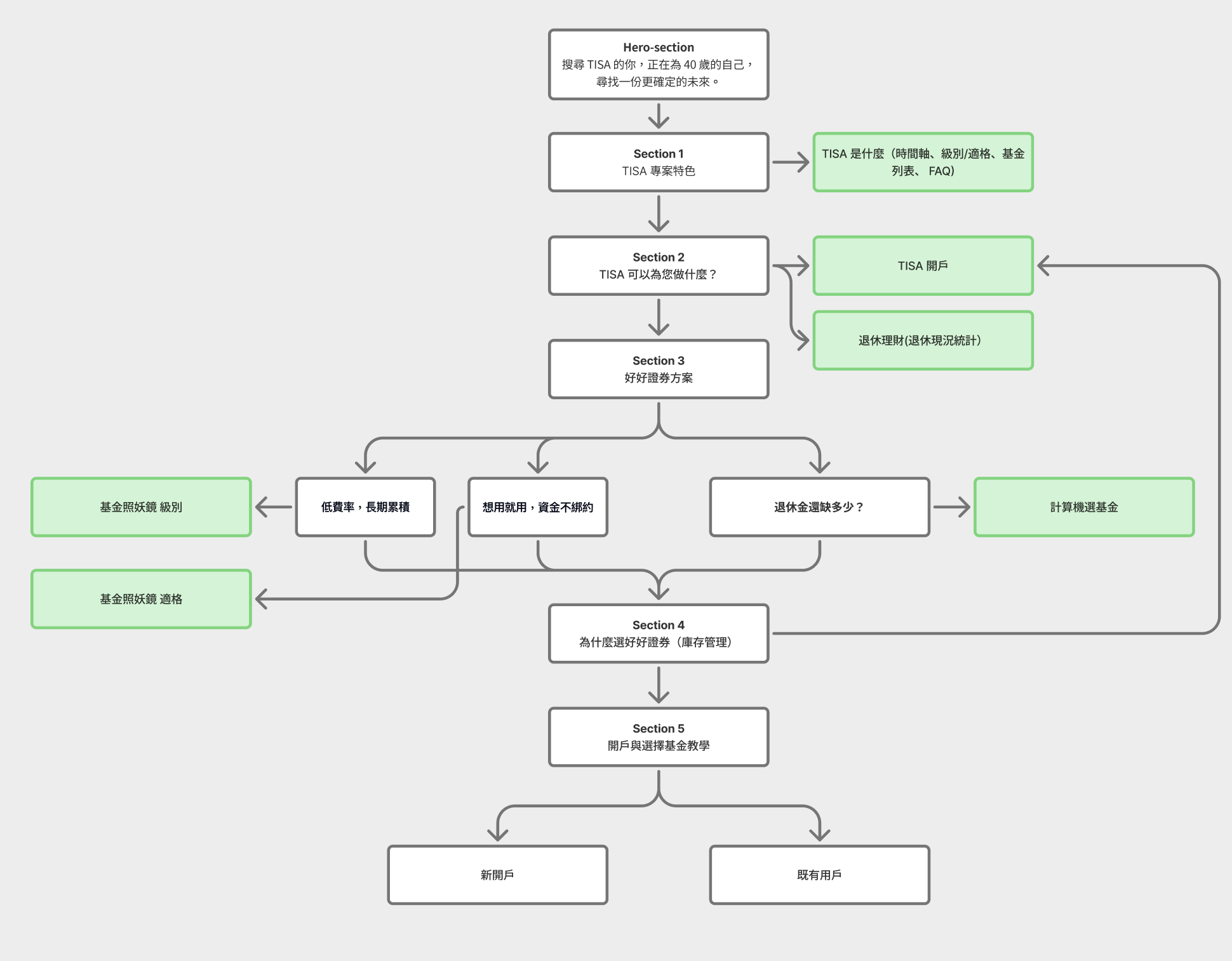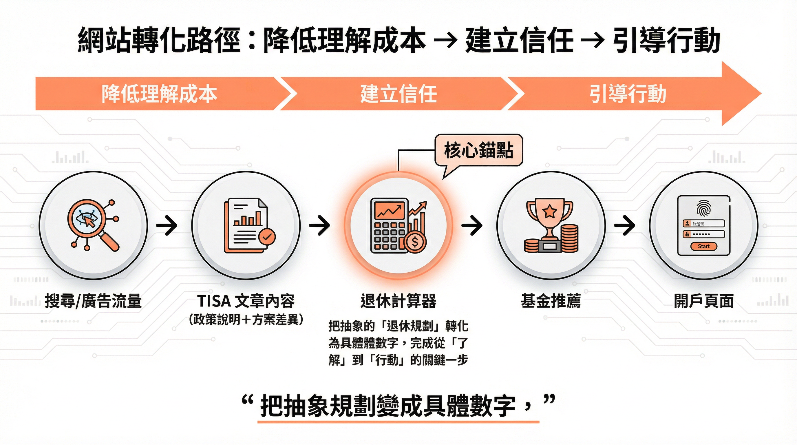 計算器是這條路徑的核心錨點,它讓用戶把抽象的「退休規劃」轉化為具體的數字,是從「了解」到「行動」最關鍵的一步。