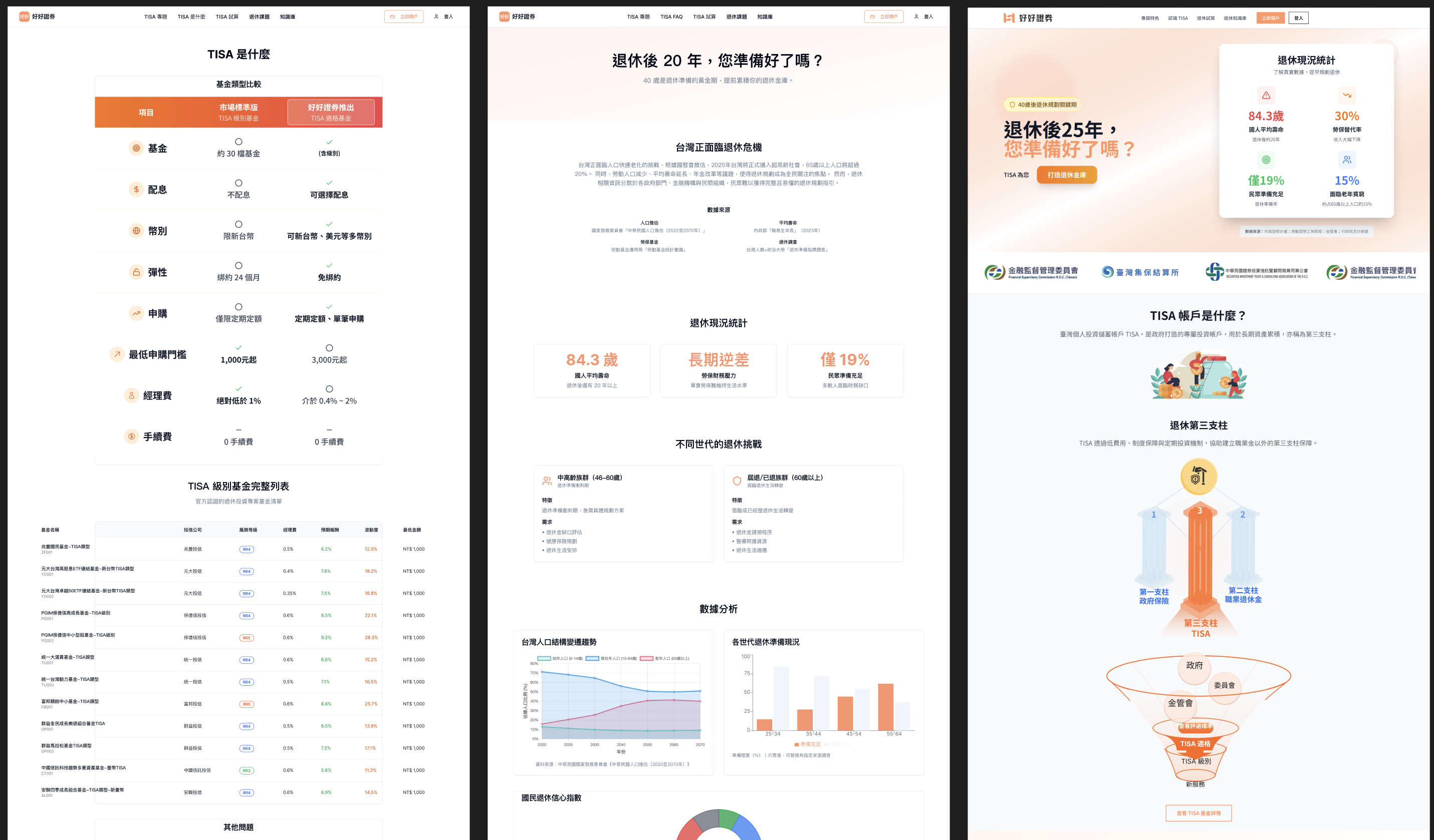 針對 TISA 說明頁的多版本佈局探索,重點在於如何在一個頁面內同時承載政策說明、好好證券方案差異(TISA 級別 vs TISA 適格基金),以及引導用戶前往計算器的視覺動線。